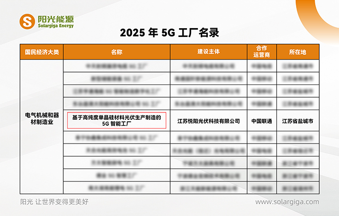 8 月 25 日,工業和信息化部公示了《2025年 5G 工廠名錄》,陽光能源控股有限公司(以下簡稱“陽光能源”)旗下江蘇悅陽光伏科技有限公司(以下簡稱“悅陽基地”)憑借其在光伏制造領域先進的 5G 融合應用成果,成功入選這一國家級名錄。